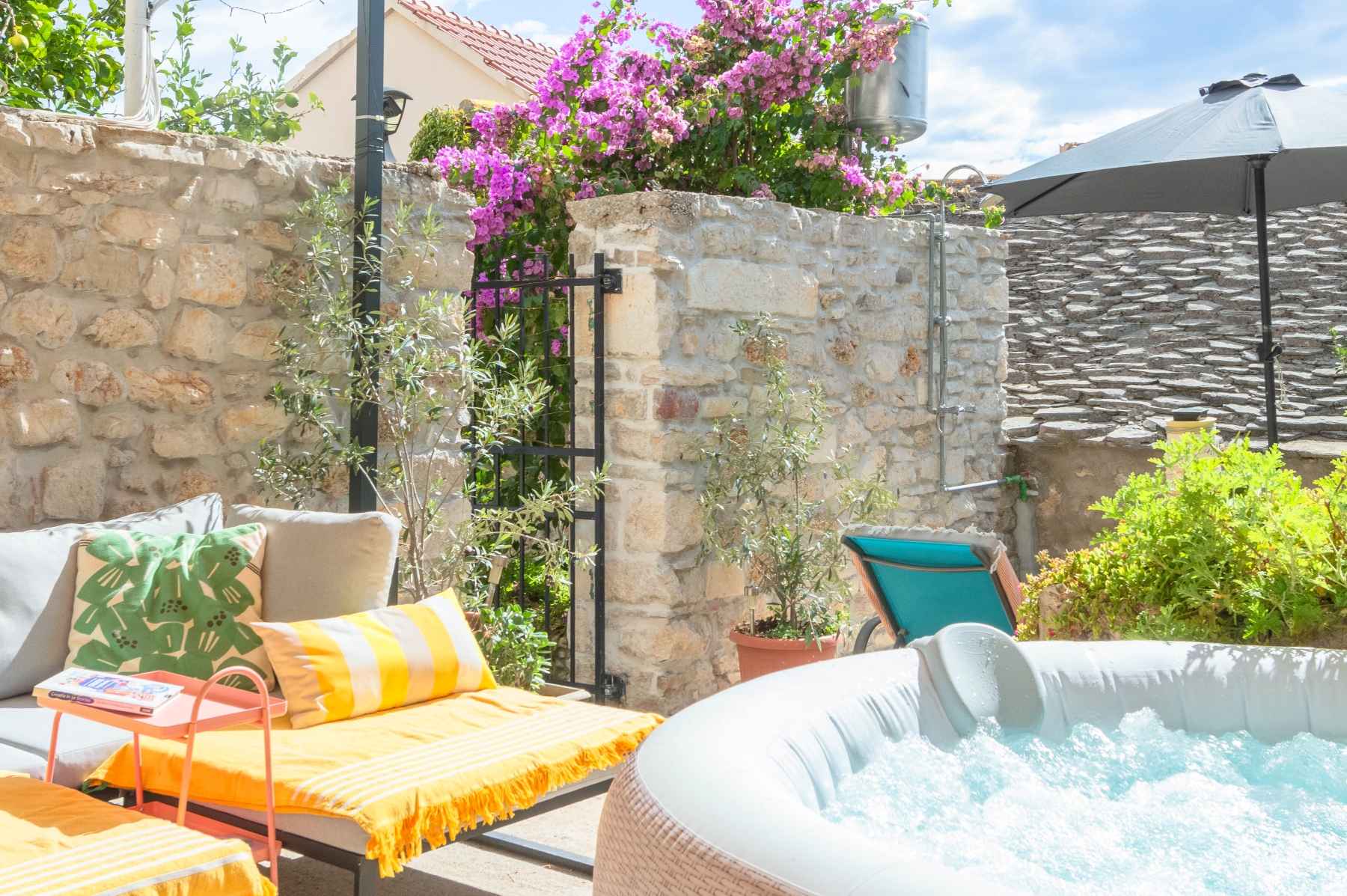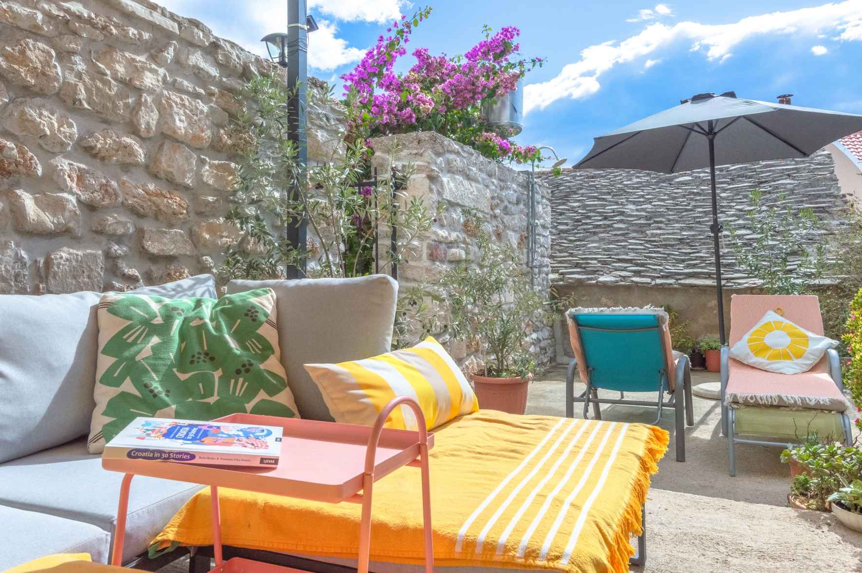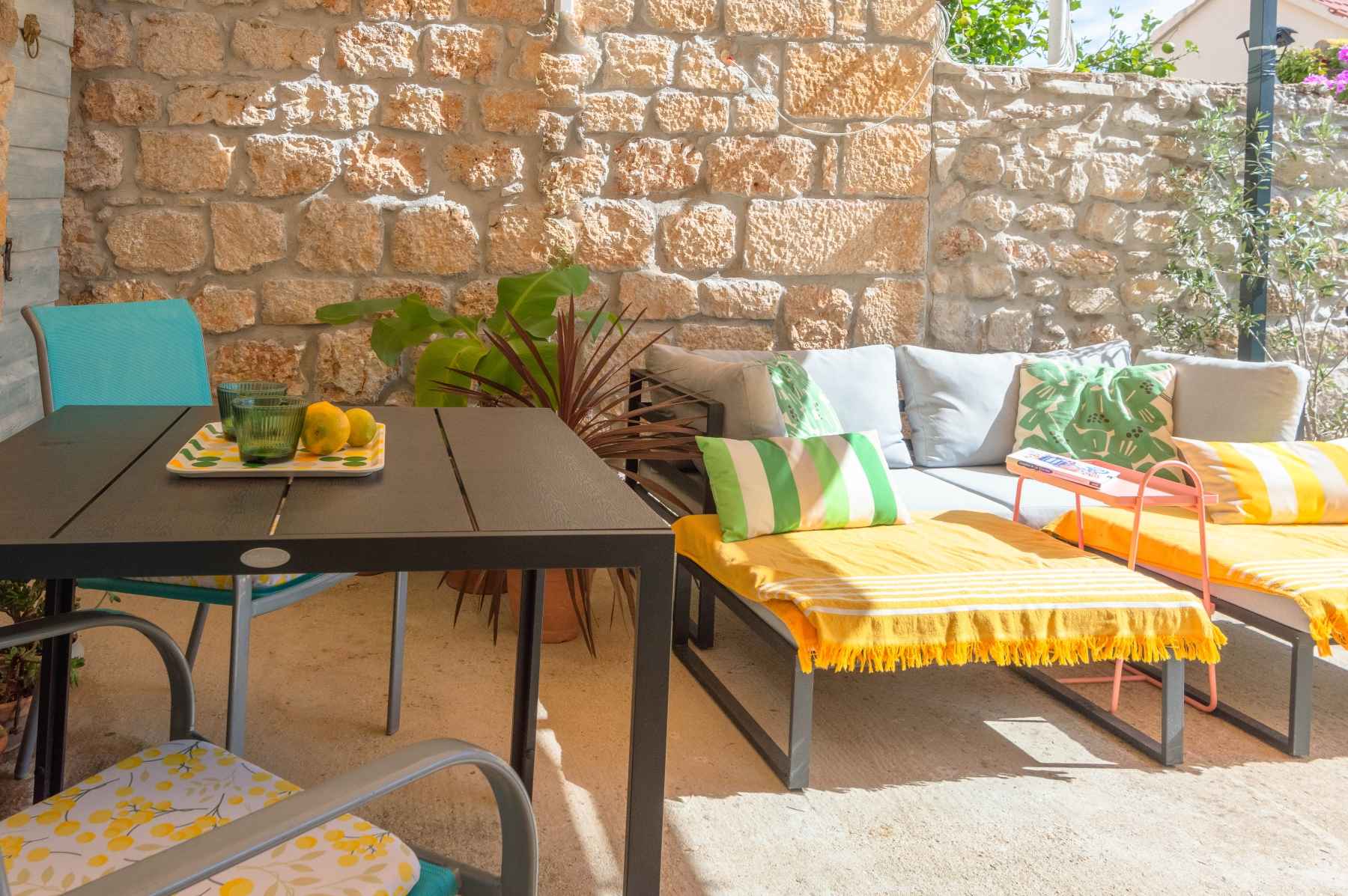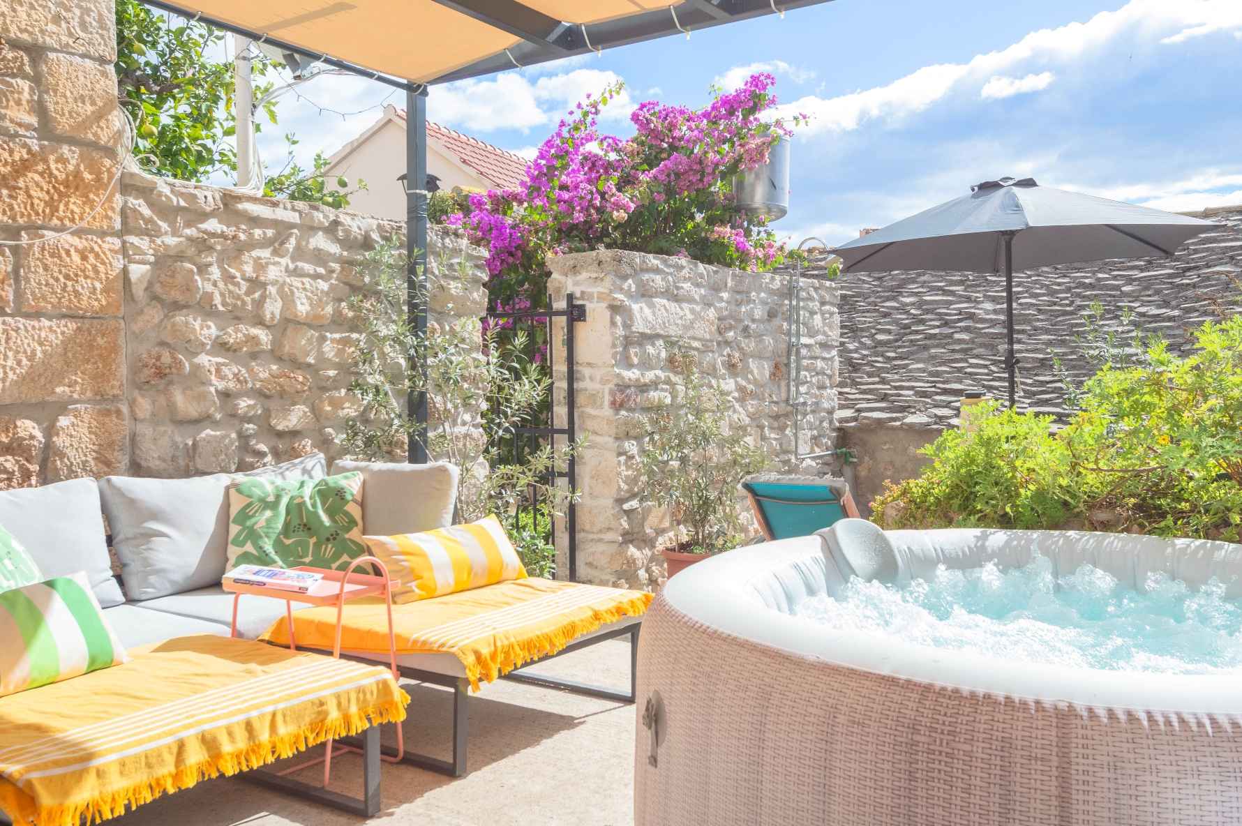 Sara Apartments im Erdgeschoss, Steinhaus in der Altstadt von Bol. Moderne, komfortable, komplett ausgestattete Ferienwohnungen für 2 Personen, mit Terrasse, Meerseite / Südseite. Außengrill, Whirlpool. Ideal für einen ruhigen Urlaub. Einkaufsgeschäft 20 m, Zentrum / Hafen 200 m, Strand 200 m. Überdachter Parkplatz vor dem Haus - eine schmale Zufahrtsstraße - Breite 2 m. 1. APPARTEMENT SARA: 40 m2, kostenloser W-Lan Internetzugang, ein Schlafzimmer mit Kingsize-Bett, klimatisiertes Wohnzimmer mit Sofa, Sat-TV, Badezimmer: Waschmaschine, Fön, Dusche, WC, Küche komplett ausgestattet mit Geschirr, Töpfe, Spülmaschine, el. Backofen, Toaster, Mixer, Wasserkocher, Kaffeemaschine, Kühl- und Gefrierschrank, Mikrowelle, Insektenschutzgitter (Netze) an den Fenstern, überdachte Terrasse, Gartenmöbel, Meerseite, Südseite, Parkplatz vor dem Haus (schmale Zufahrtsstraße 2) m breit), Handtücher, Bettwäsche und Geschirrtücher.