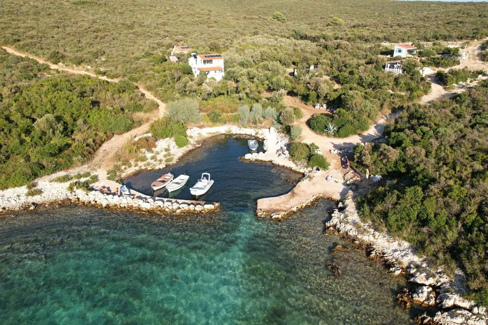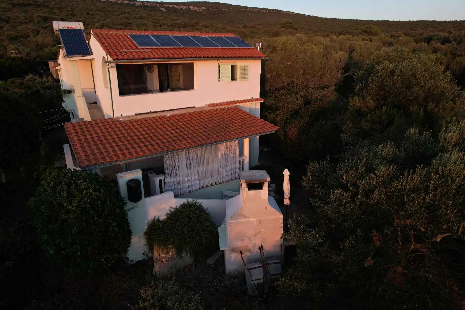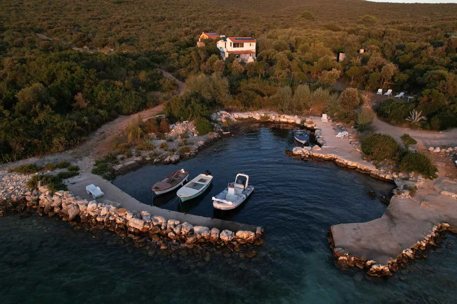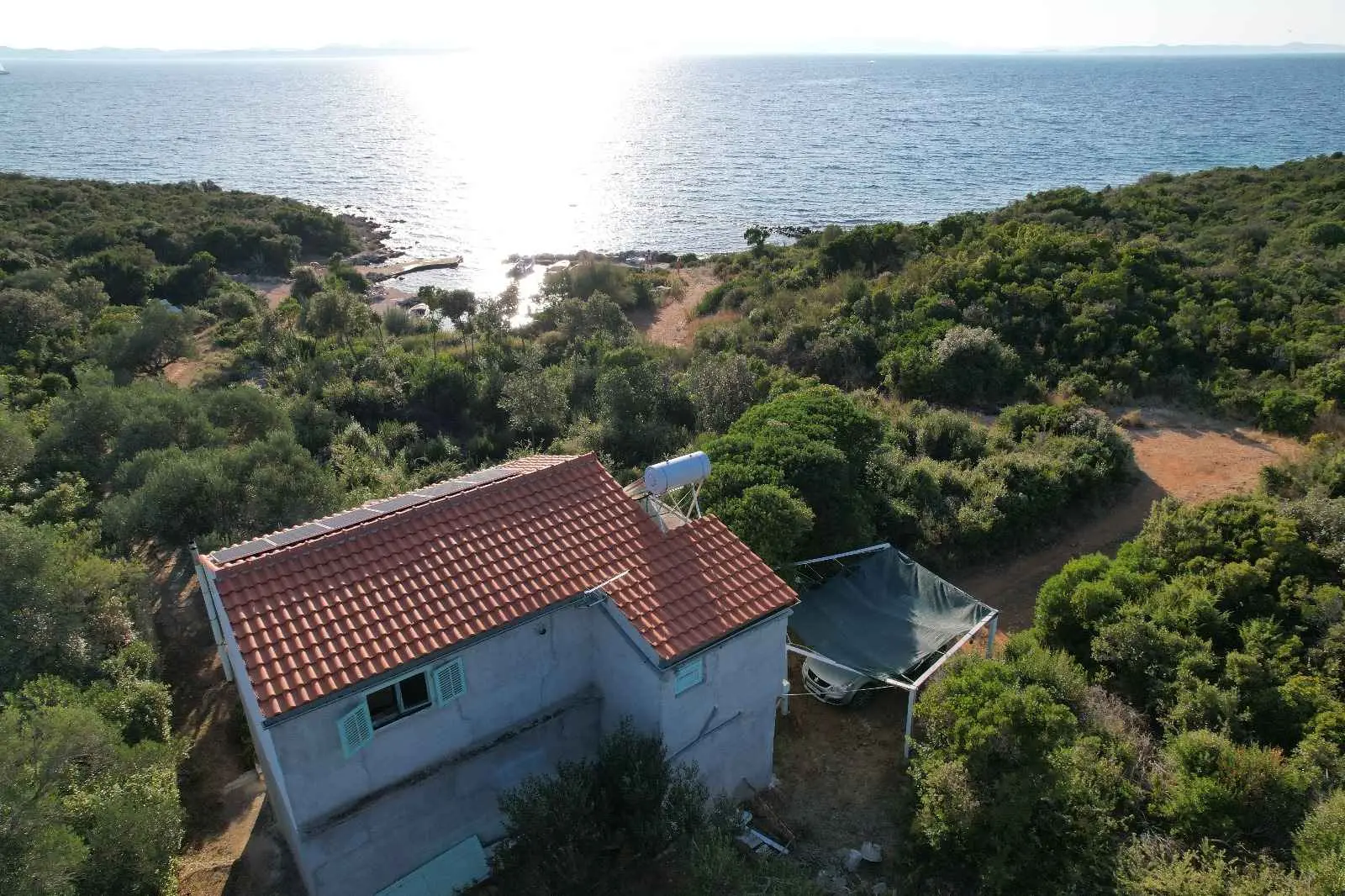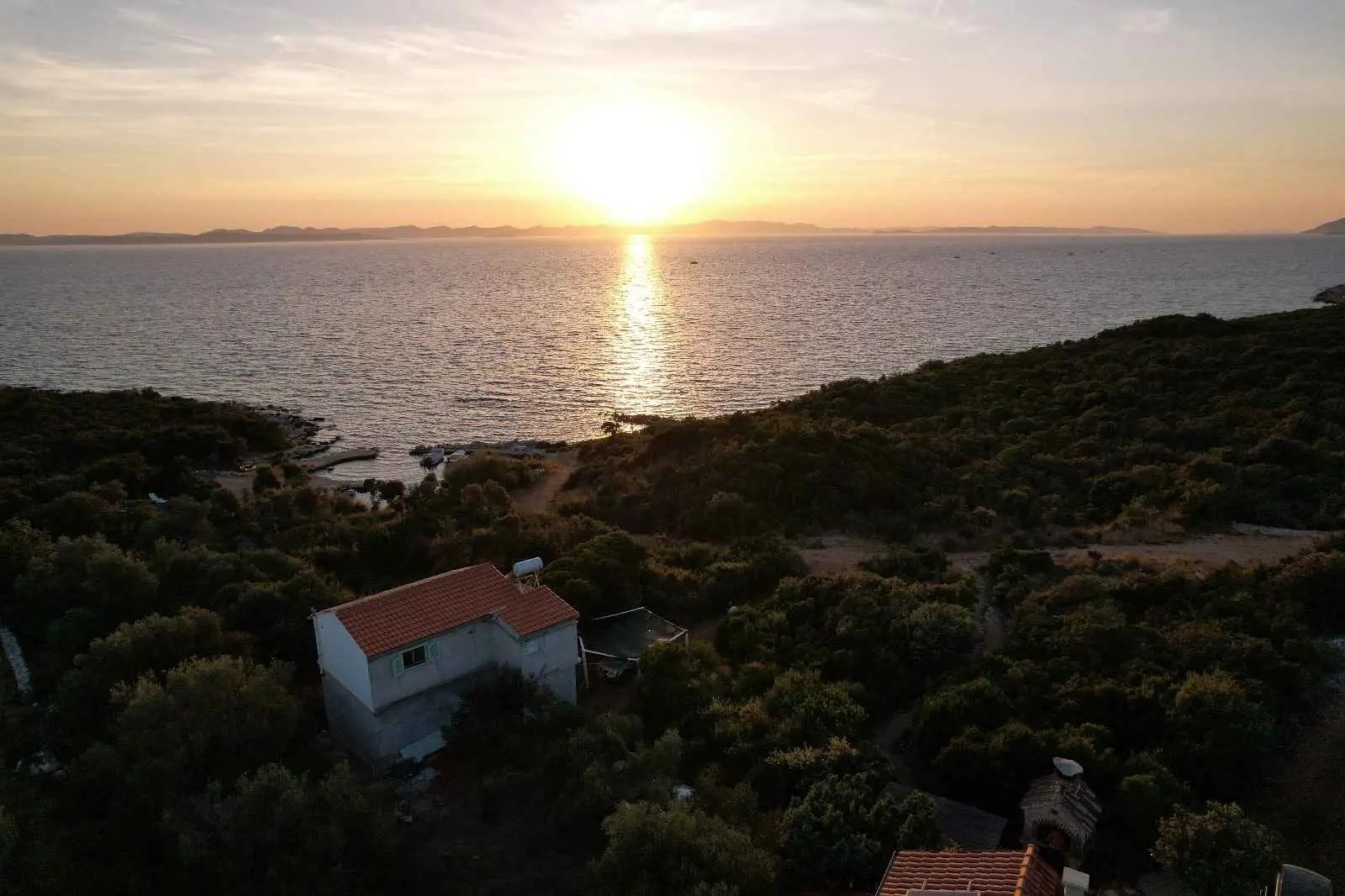 Das Robinsonhaus „Sunset Romance“, GANZ zu vermieten, befindet sich auf der Südseite der Insel Pašman, in einer wunderschönen kleinen Bucht, Stivanja, 50 m vom Meer entfernt, erste Reihe zum Meer, 5 km von der Stadt Neviđane entfernt, auf der Nordseite der Insel, die mit der Fähre Zadar – Preko (20 km mit dem Auto) oder Biograd – Tkon (15 km) erreichbar ist. Es ist von der Staatsstraße D 110, Kreuzung Neviđane, auf einer unbefestigten Straße, die vorsichtigeres Fahren erfordert, direkt zum Parkplatz neben dem Haus zu erreichen oder mit dem Boot, einem kleinen Schnellboot, in der Bucht zu einem vereinbarten Platz. Für Ihr Boot ist eine vorherige Absprache erforderlich, damit in der Bucht Platz ist! Es ist umgeben von Grün und Olivenbäumen auf einem 400 m2 großen Grundstück, erste Reihe zum Meer, das sich bis zu 10 m vom Meer entfernt erstreckt, neben vier kleineren Häusern in 20 m Entfernung, die ebenfalls zu vermieten sind. Das Haus bietet Platz für bis zu 6 (sechs) Personen (2x(2+1)+1), verfügt über ein Erdgeschoss und ein Obergeschoss mit Terrassen und ist nach Süden ausgerichtet mit Blick auf das Meer, den Nationalpark Kornati und die Inseln des Zadar-Archipels. Im Erdgeschoss befinden sich ein großer Grill, eine Terrasse mit Tisch und Stühlen, eine Solar-Außendusche sowie Zugang zur Küche und zum Wohnzimmer. Die Küche ist mit Spüle, eingebautem 4-fach-Gasherd, kombiniertem Kühlschrank, Geschirrspüler, Mikrowelle, Mixer und Wasserkocher ausgestattet. Neben der Küche befindet sich das Wohnzimmer mit Bartheke und Stühlen sowie einem Einzelbett. Vom Wohnzimmer aus gelangt man auf der einen Seite in das Badezimmer mit Dusche, Warmwasser und Toilette und auf der anderen Seite in ein Schlafzimmer (2+1) mit einem Doppelbett und einem Einzelbett sowie einer separaten Toilette! Für kältere Tage ist das Haus mit einem Holzofen ausgestattet. Von der Terrasse führt eine offene Treppe in das Obergeschoss. Wohnzimmer mit Tisch und Stühlen, Eingang zur Küche mit Spüle (Warmwasser) und Kühlschrank, Gasherd (kein Backofen), Badezimmer mit Dusche sowie zum Schlafzimmer (2 + 1) mit einem Doppelbett und einem Einzelbett für eine Person, separate Toilette. Vom Wohnzimmer aus gibt es einen Ausgang zur Terrasse mit kleinem Tisch und Sesseln und Aussicht auf das Meer und die Inseln. Das Wasser im gesamten Haus ist Regenwasser – Trinkwasser, es wird mit einem Tankwagen gebracht. Es wird empfohlen, das Wasser vor der Verwendung zum Trinken abzukochen. Tank 10 m3. Es ist notwendig, sparsam damit umzugehen, da es von einem Tankwagen aufgefüllt wird, der nicht immer sofort verfügbar ist. Der Strom kommt von 6 Solarkollektoren, im ganzen Haus 220 V. Alle Räume sind mit LED-Energiesparlampen beleuchtet. Smart-TV und WLAN! Auf dem eigenen Grundstück, 10 m vom Meer entfernt, sind Liegestühle aufgestellt, um Sonnenuntergänge und eine Pause von der strahlenden Sonne zu genießen. Hinweis: In der Vor- und Nachsaison vom 26. April bis 17. Mai und vom 27.9. bis 2025 ist es möglich, nur das Erdgeschoss für 2 Personen zu mieten, mit bis zu 20 % Rabatt (Haustierpreis bleibt 8 € pro Tag). Wir empfehlen Ihnen, nach Ihrer Ankunft den allgemeinen Zustand des Hauses zu überprüfen, um Unannehmlichkeiten zu vermeiden. Spätere Reklamationen werden nicht akzeptiert! Wir bitten Sie, eventuelle Schäden rechtzeitig zu melden, damit diese rechtzeitig behoben werden können. Die Endreinigung ist obligatorisch und kostenlos. Ihre Gastgeber wünschen Ihnen einen schönen Urlaub!