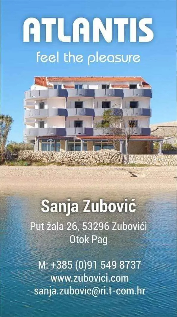 AtlantisPagNovalja - erste Reihe am Sandstrand von Zubovici in der Nähe von Novalja auf Pag, wir bieten Zimmer mit einem im Preis inbegriffenen Frühstücksbuffet. Tagsüber bieten wir tägliche Touristenmenüs zu angemessenen Preisen sowie À-la-carte-Menüs an. www.zubovici.com